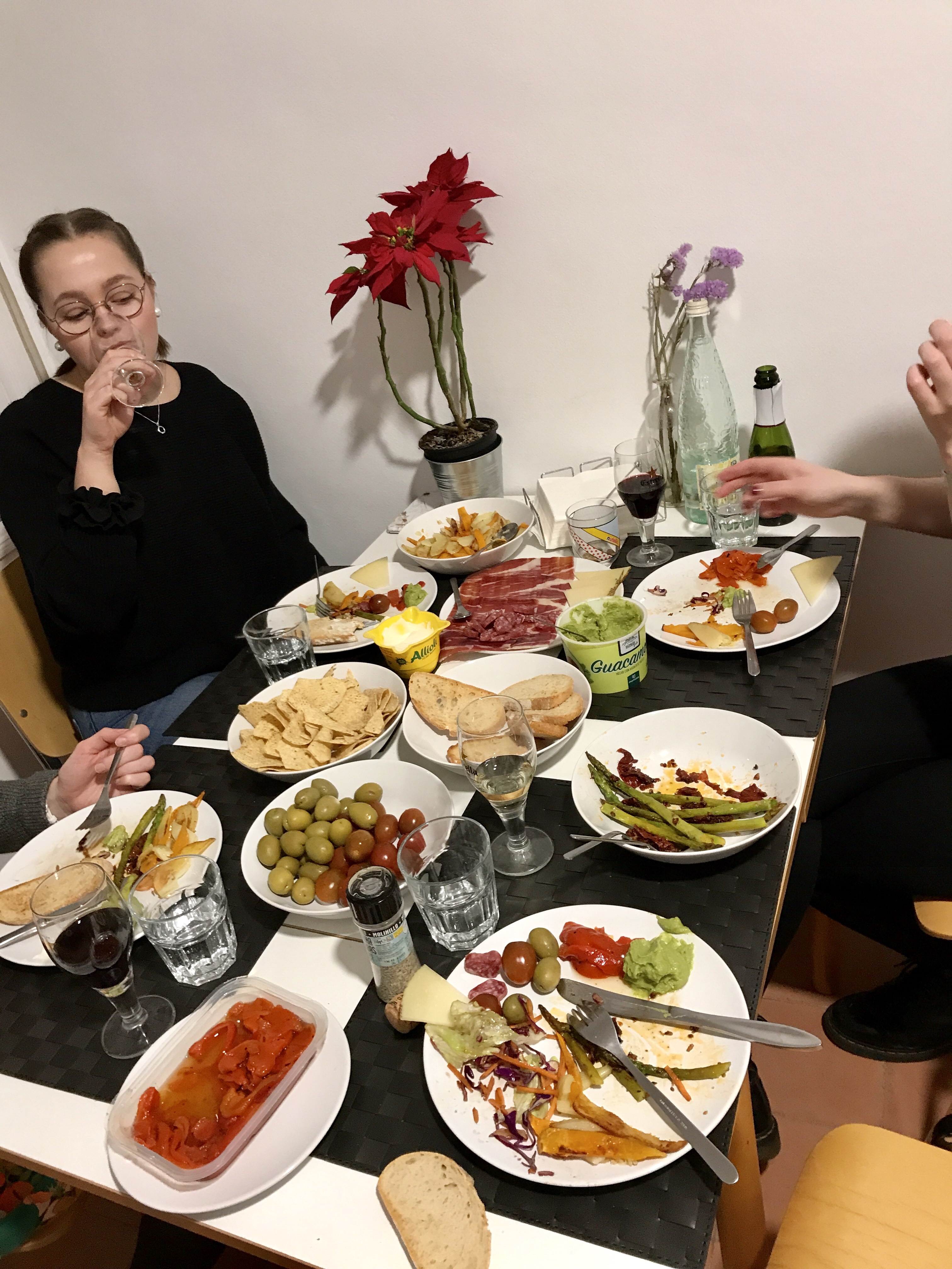 Om kvelden laget vi tapas hjemme, og fikk hyggelig selskap før vi joinet Erasmus-gjengen sin karaokekveld.